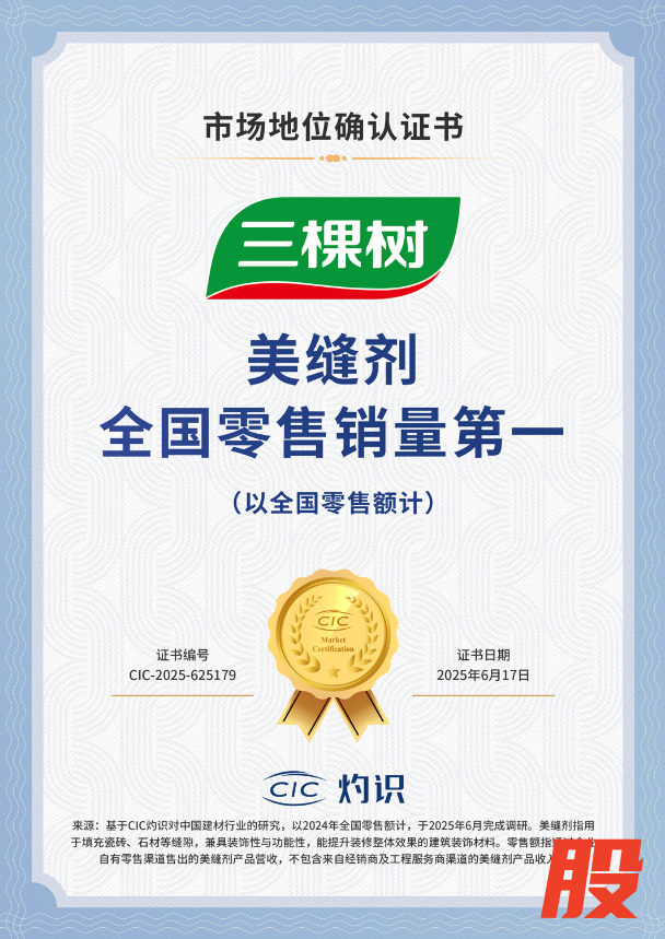 CIC灼识在中国建材行业有长期丰富的研究经验。在2025年6月期间,CIC灼识采用科学、严谨的统计与分析方法,对中国建材行业开展了深度调研和专项的系统性研究。基于对行业竞争格局、产品类型等方面的详尽调研与深度分析,CIC灼识确认三棵树“美缝剂全国零售销量第一(以2024年全国零售额计)”的市场地位。